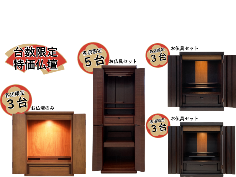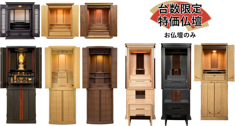 在庫限りの超特価仏壇や新作仏壇、人気のキャンドル割引など、